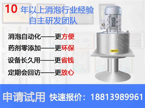 隨著技術的發展,工藝的更新換代,在消泡方面已經越來越進步了,越來越方便了,也越來越環保了,那就是使用機械消泡器消泡。為什么說越來越方便了呢?使用傳統的消泡劑消泡,需要人工對藥劑的調配,添加,并且消泡能力隨著時間流逝而逐漸降低,需要專門安排人員進行觀察,一不小心,泡沫又會再次溢出。使用機械消泡器,接上電源啟動,便可以自動消泡,消泡過程無需人工看管,消泡能力持續穩定,不再為泡沫的產生而煩躁了。那么又為什么說越來越環保了呢?使用傳統消泡劑消泡,雖然說泡沫消了,但是會增加COD含量,使得處理費用增加。機械消泡器屬于物理消泡,消泡過程不需要添加化學藥劑進行輔助消泡,不會增加COD,環保消泡。